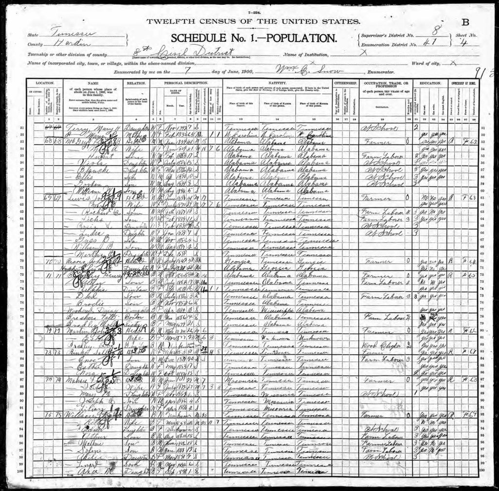 Henry Bradley was born Oct. 1865 in Township 7, Crenshaw, Alabama. He is listed as Mulatto (later as Negro). Henry married in 1886 at the age of 21. His wife is unnamed. He lived in Civil District 8, Hardin Co. Savannah, Tennessee throughout his life. Henry worked as a farmer at age 35. He fathered three sons and one daughter. According to 1900 US Census, Henry resided in dwelling lot 71 with his five children and his sister, Molly. Fate Breshers, a teenage boarder and farm laborer, is also listed as a resident. Henry could read and write.